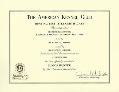 Apollo passed his fourth AKC Junior Hunt Test and earned his JH title. Colorado Foothills Retriever Club hosted the test at Stillroven Farm in Weld County, Colorado. Jeff Baldwin and Sally Sjobeck judged the test.
