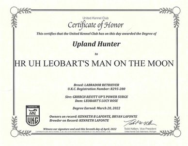 Apollo is a handsome 75-pound chocolate Labrador Retriever. He is 100% amateur trained. Apollo has gone 12 for 12 in upland tests and received his UHCH title in October 2024. He has 350 HRC points. Apollo is currently